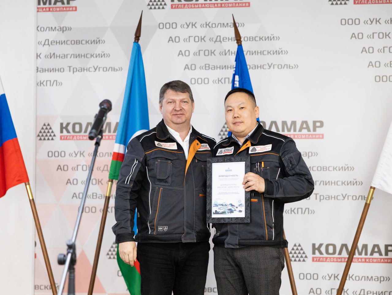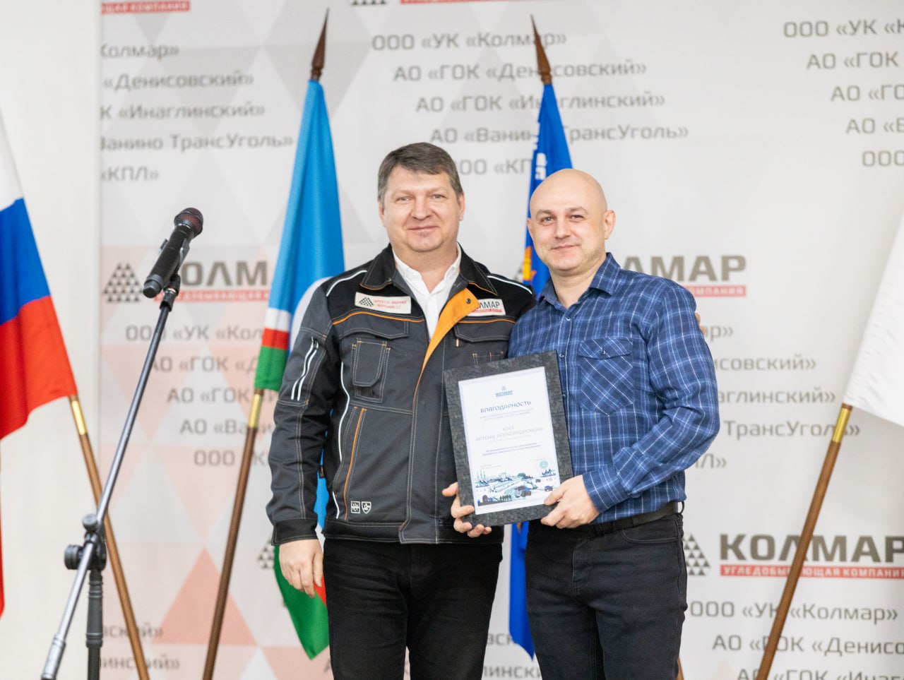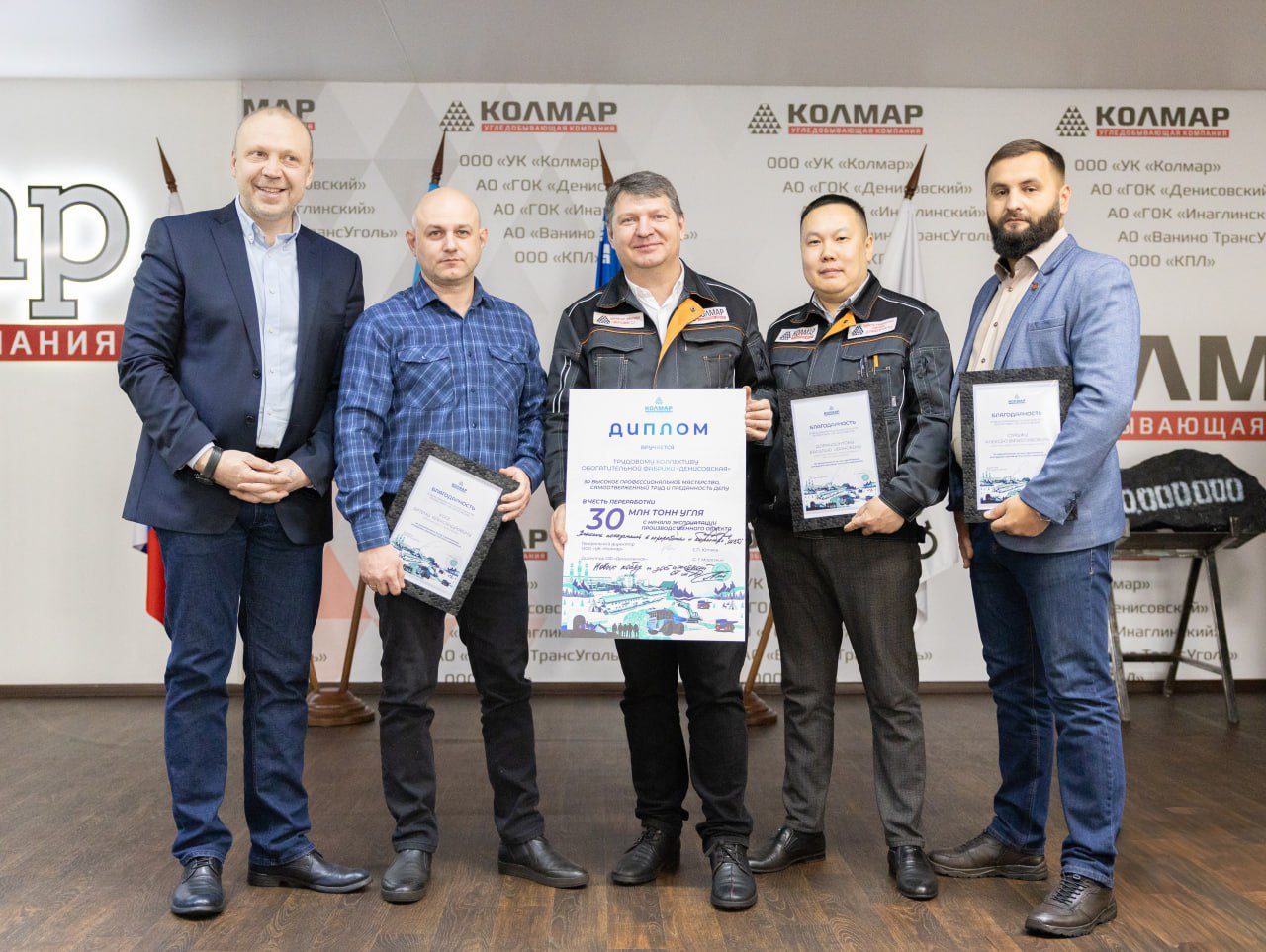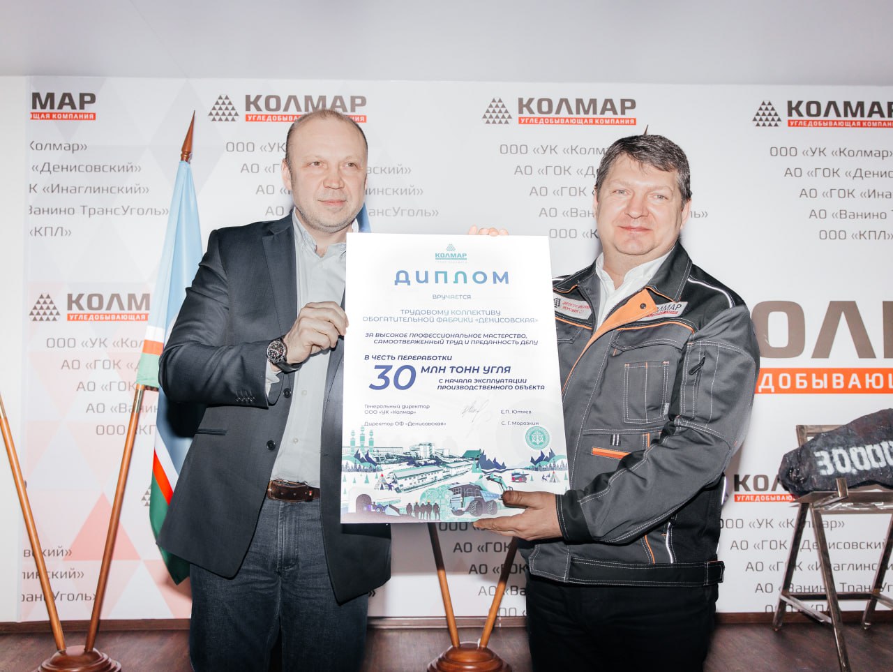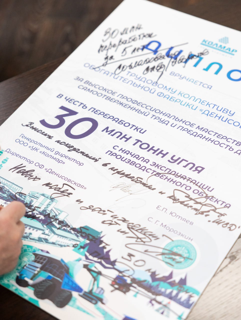 На торжественном собрании, посвященном знаковому событию, трудовому коллективу вручён памятный диплом. Прозвучали поздравления от заместителя генерального директора по эксплуатации и ремонту оборудования ООО «УК «Колмар» Сергея Хворостова и директора обогатительной фабрики «Денисовская» Сергея Морозкина.
