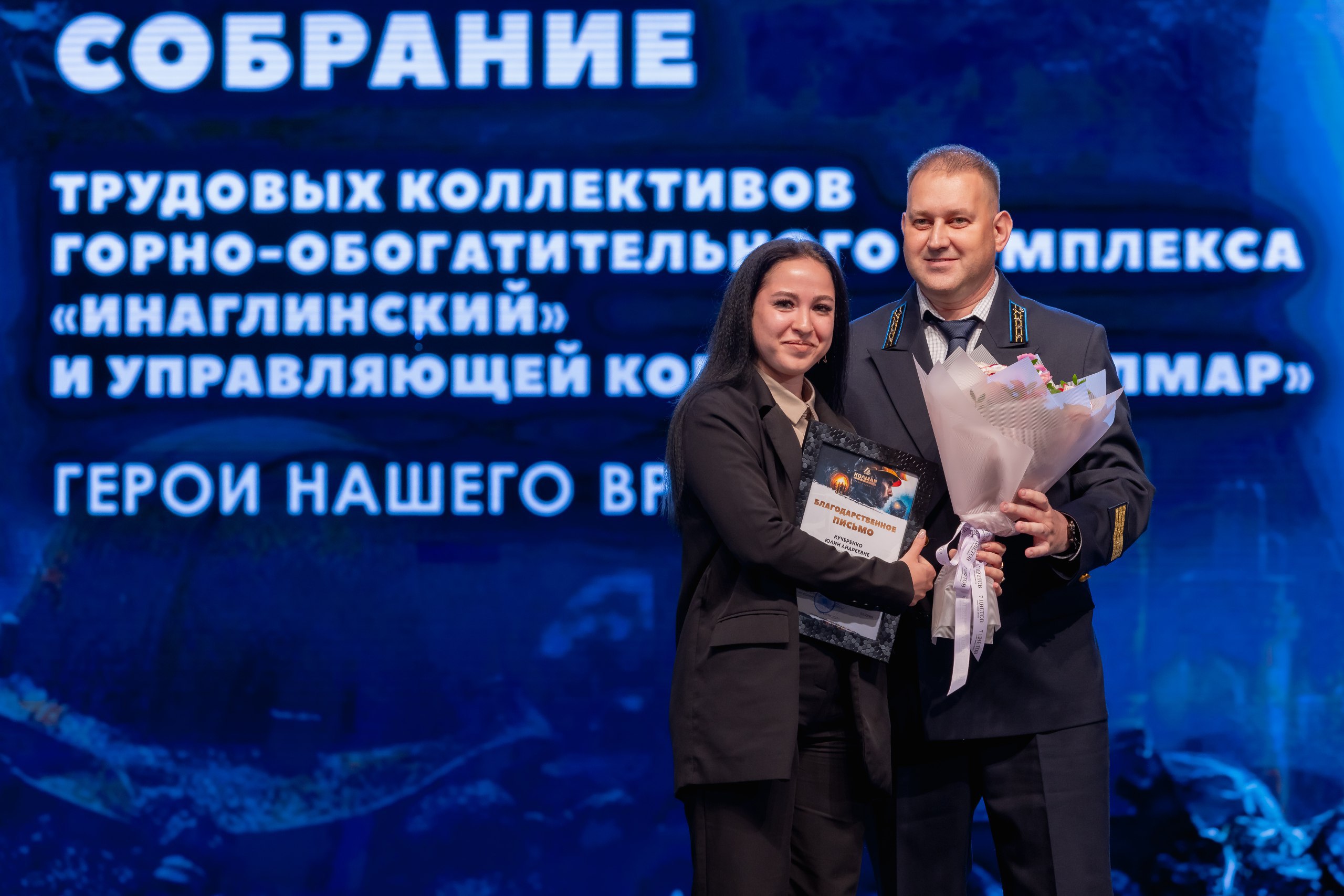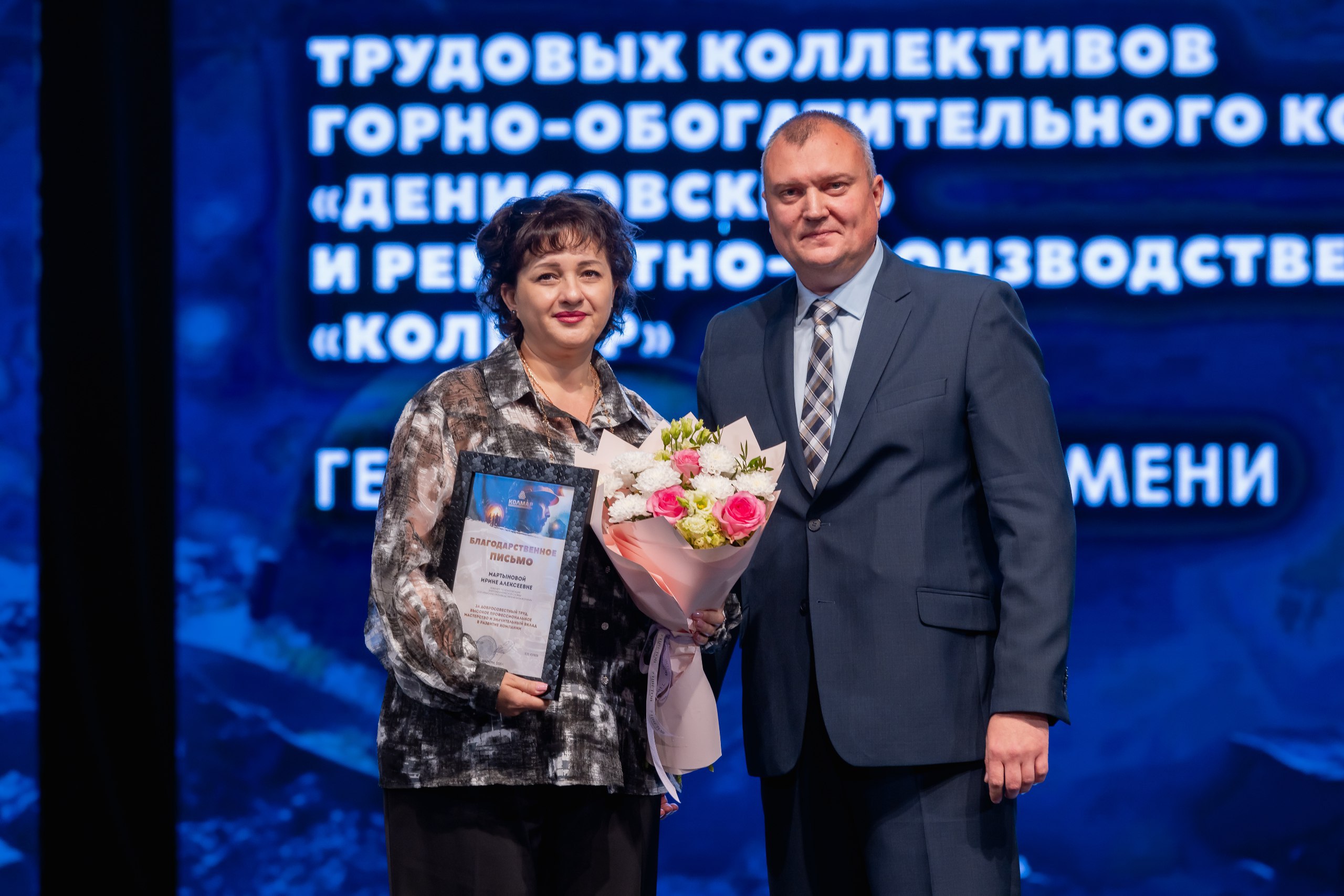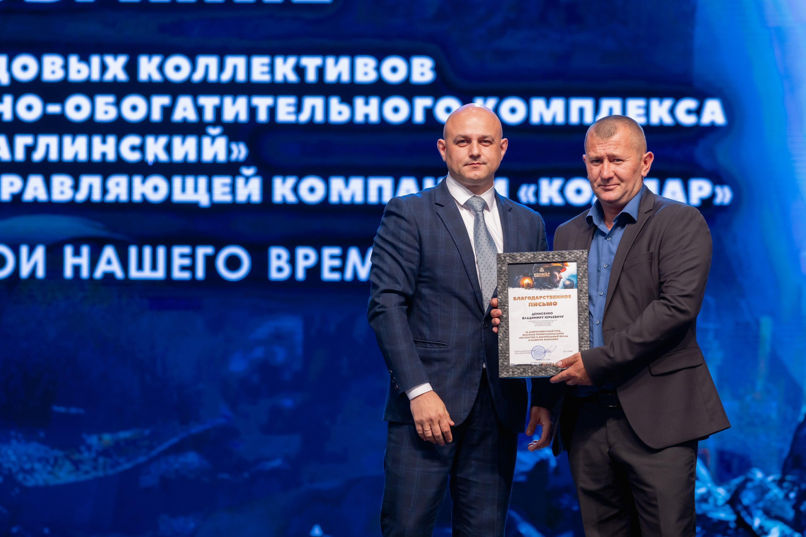 Кульминацией праздника стало вручение корпоративных наград от ООО «УК «Колмар». Благодарственными письмами ООО «УК «Колмар» были поощрены 24 сотрудника шахты «Денисовская», 30 — с «Восточной Денисовской», 44 работника шахты «Инаглинская», с участка открытых горных работ — 2.