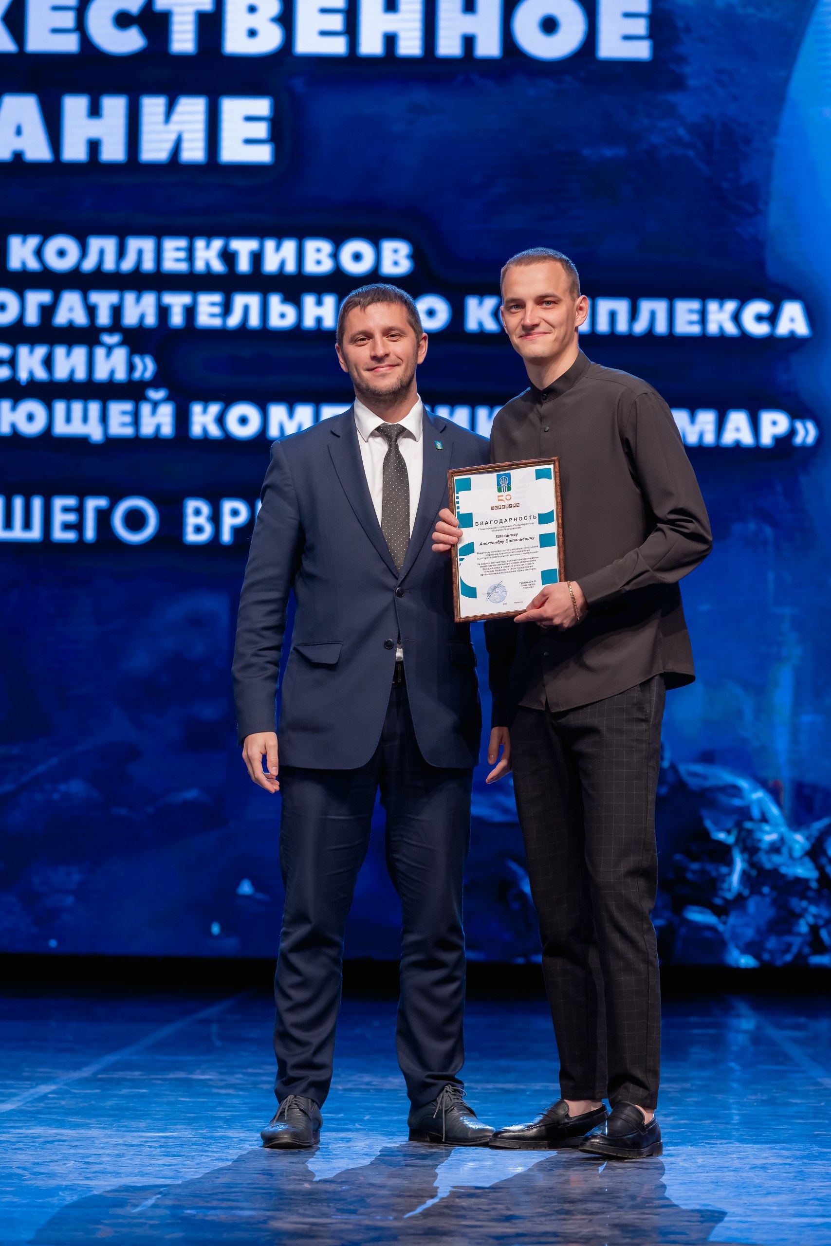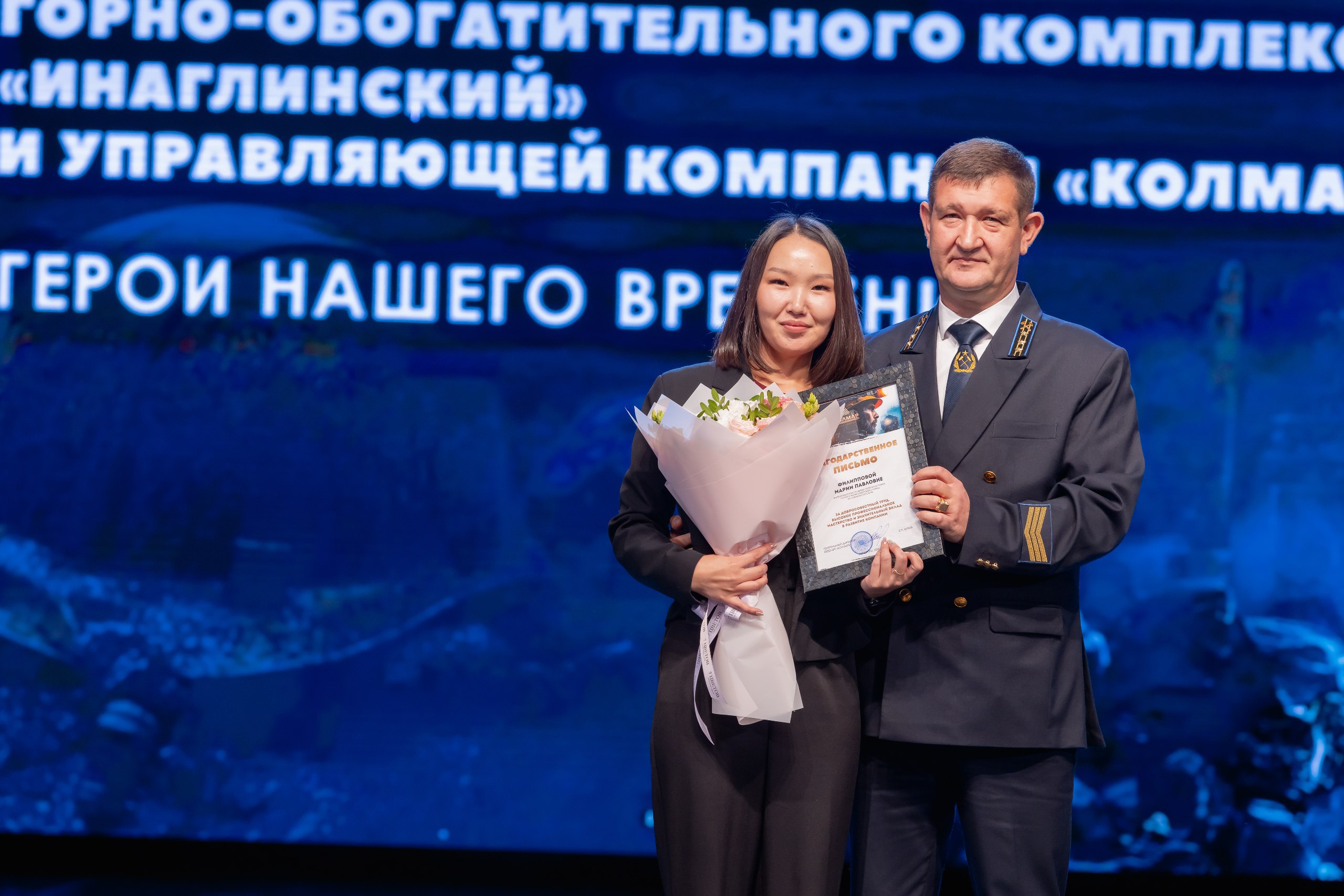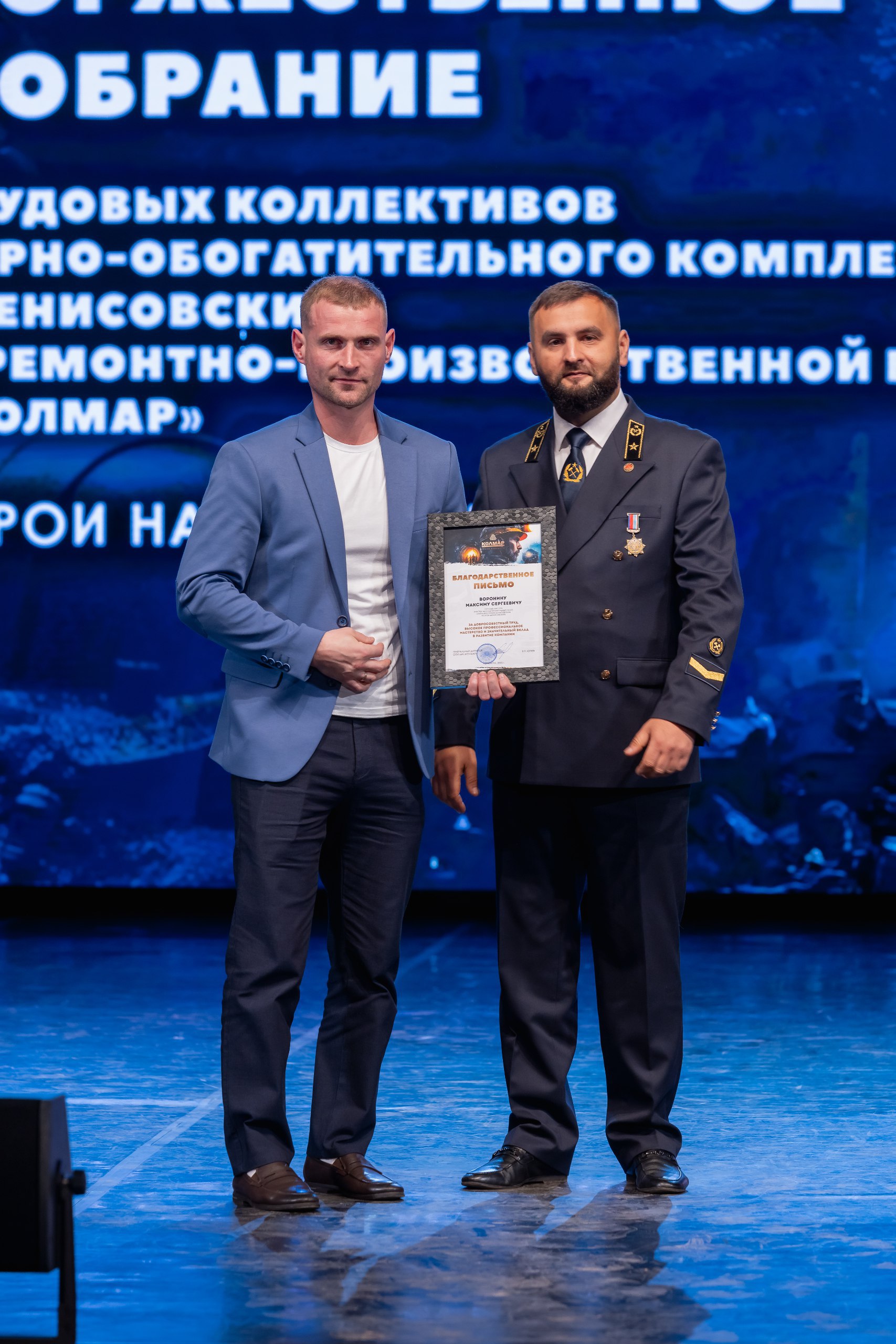 Кульминацией праздника стало вручение корпоративных наград от ООО «УК «Колмар». Благодарственными письмами ООО «УК «Колмар» были поощрены 24 сотрудника шахты «Денисовская», 30 — с «Восточной Денисовской», 44 работника шахты «Инаглинская», с участка открытых горных работ — 2.